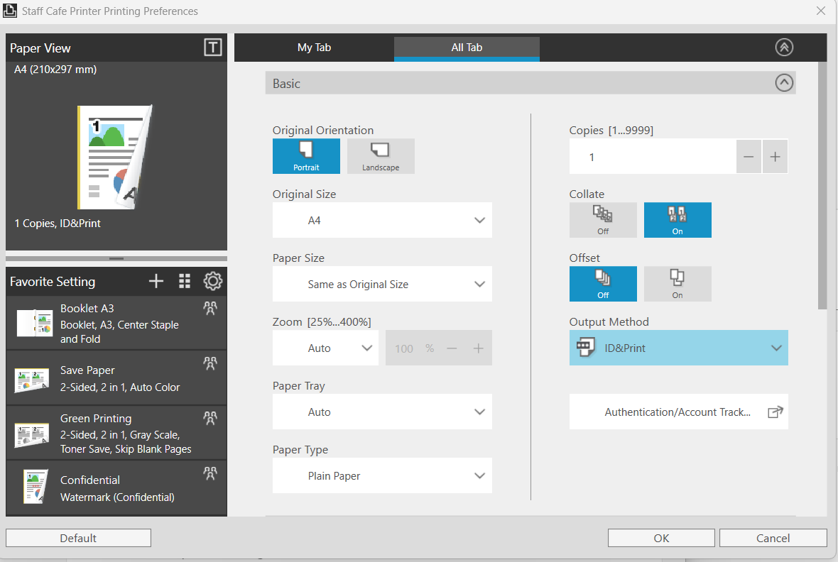 If it doesnt, please Go to the "All tab" and change "Output method" to "ID&Print", then you will need to click "Authentication" and you will see the below screen