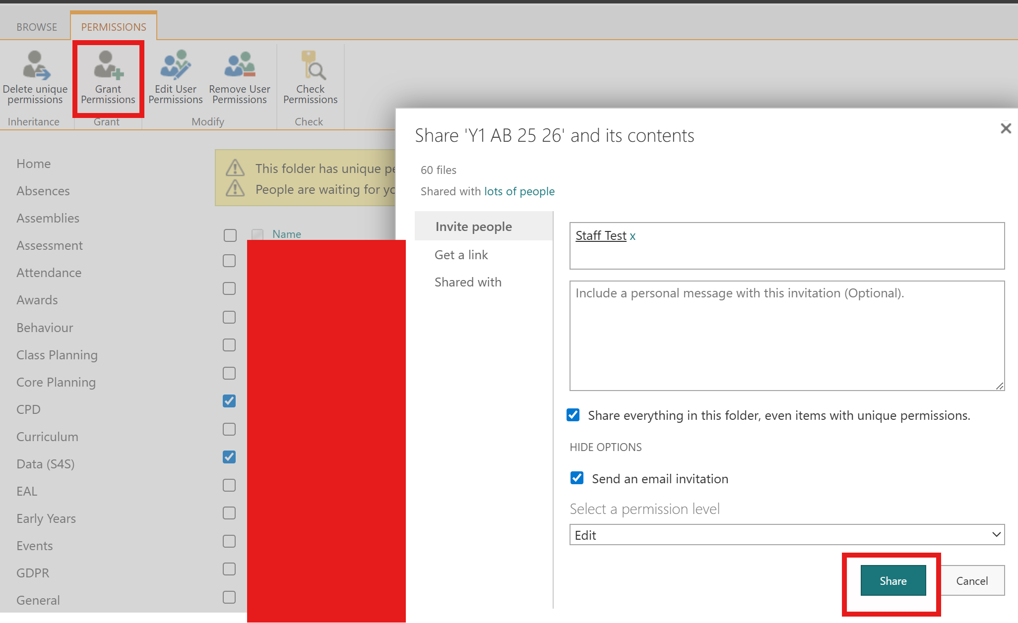 This article covers managing Sharepoint permissions within your Sharepoint site when you want them to be different to the default permissions of standard members. An example may be a safeguarding folder which is within Staff Share. You want your staff to access every folder within Staff Share, except the safeguarding one.